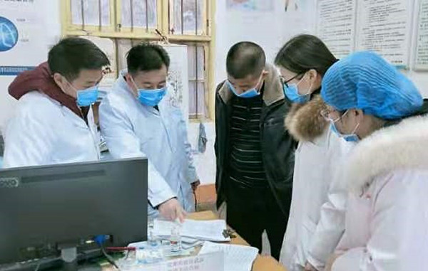 该市纪检监察干部到乡镇卫生所查看接诊发热、感冒、咳嗽类病人的登记和跟踪情况。