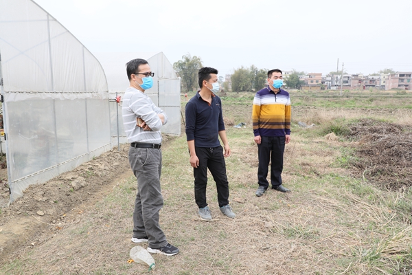 怀集县纪委监委在连麦镇莲社村甘薯扶贫项目种植基地监督检查疫情防控和扶贫工作落实情况。
